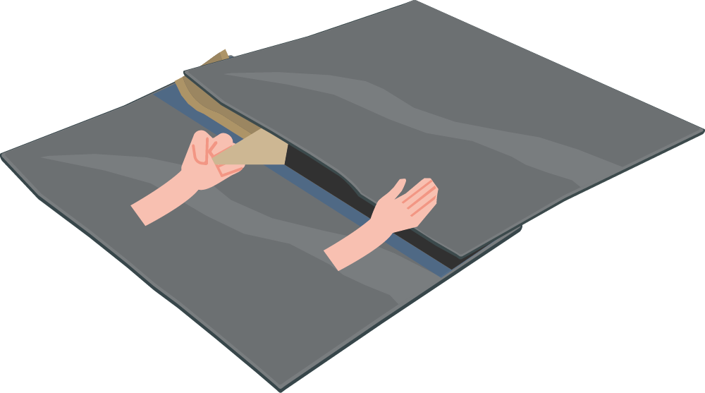 Die obere Folie leicht anheben und die Schutzlage vom EPDM Band abziehen. Die obere Bahn dabei fest mit der Hand auf die untere Bahn und das EPDM Band aufdrücken.